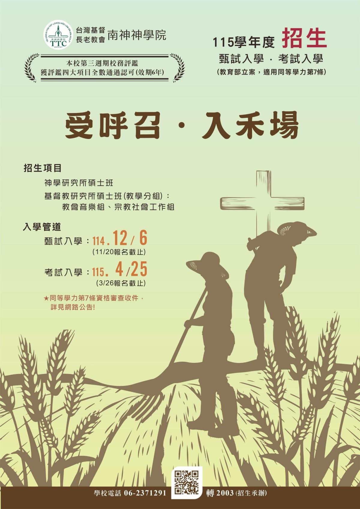 本校106學年度奉教育部核准設立神學研究所碩士班、基督教研究所碩士班,完成學業者授予部定「文學碩士」學位;經教育部112年10月26日臺教高(四)字第1122203206A號函核准,113學年度適用《入學大學同等學力認定標準》第7條招生。