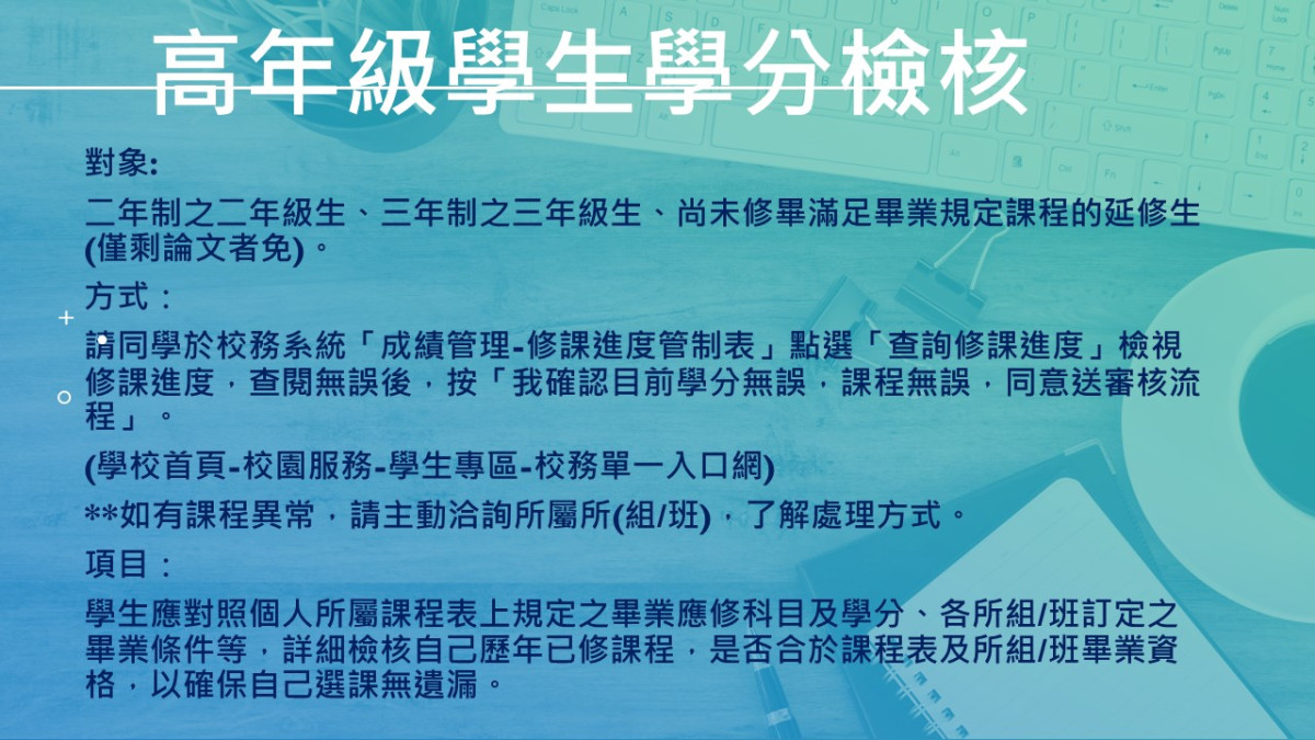 項目:學生應對照個人所屬課程表上規定之畢業應修科目及學分、各所組/班訂定之畢業條件等,詳細檢核自己歷年已修課程,是否合於課程表及所組/班畢業資格,以確保自己選課無遺漏。