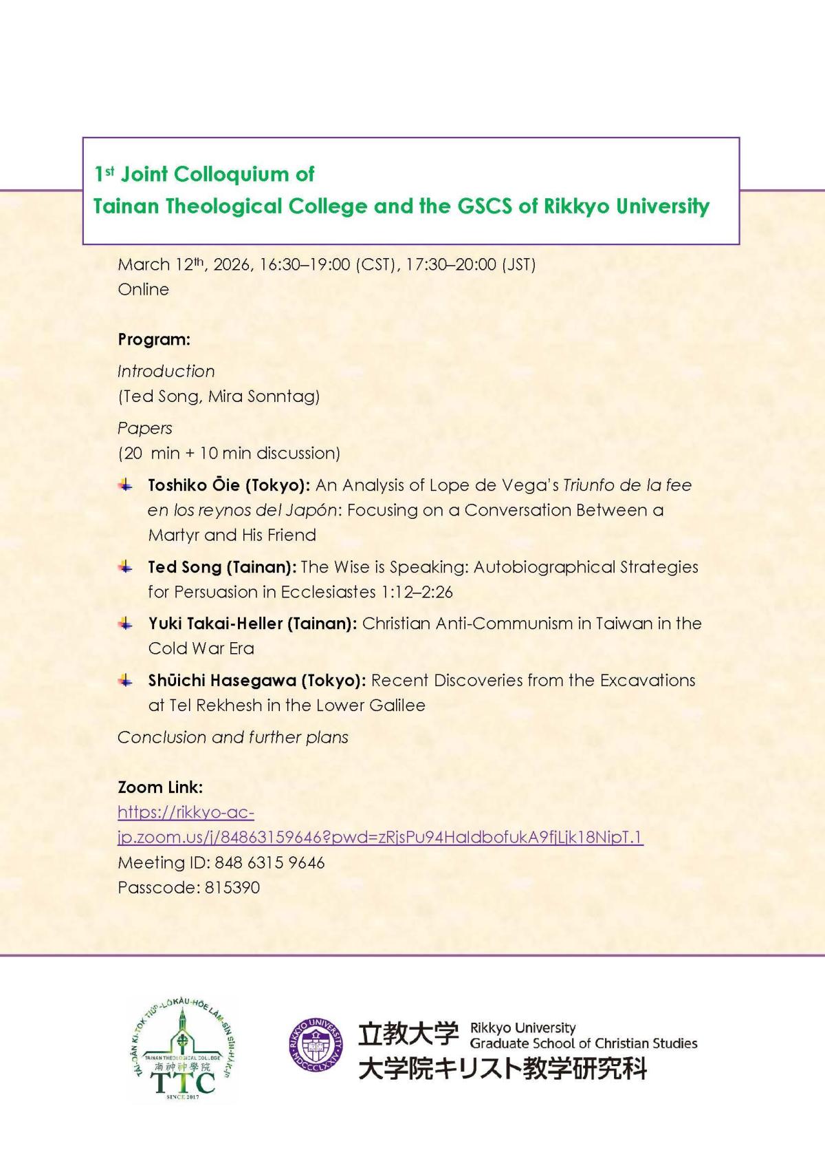 【114學年度國際學術交流工作坊】日本立教大學基督教研究所台灣基督長老教會南神神學院與姊妹校日本立教大學基督教研究院(Department of Christian Studies, Rikkyo University)將線上舉辦兩校第一次學術交流工作坊,詳細資訊如下: